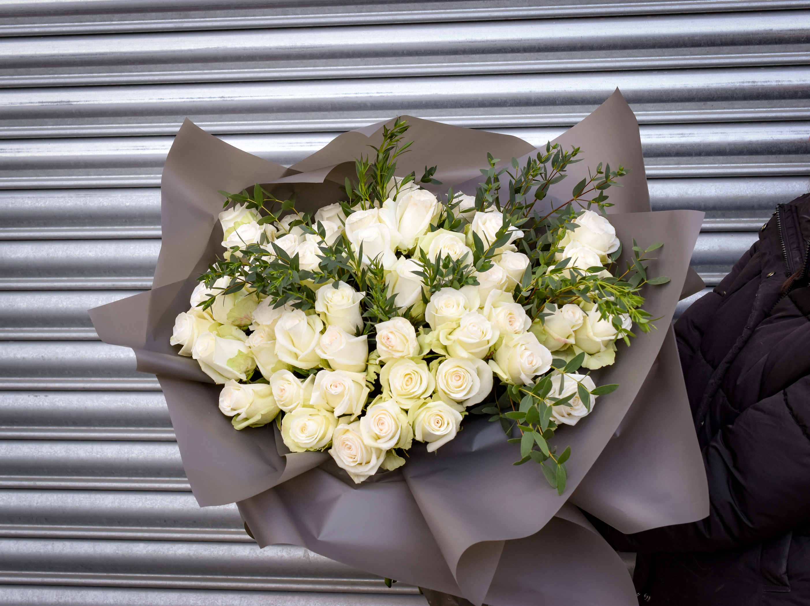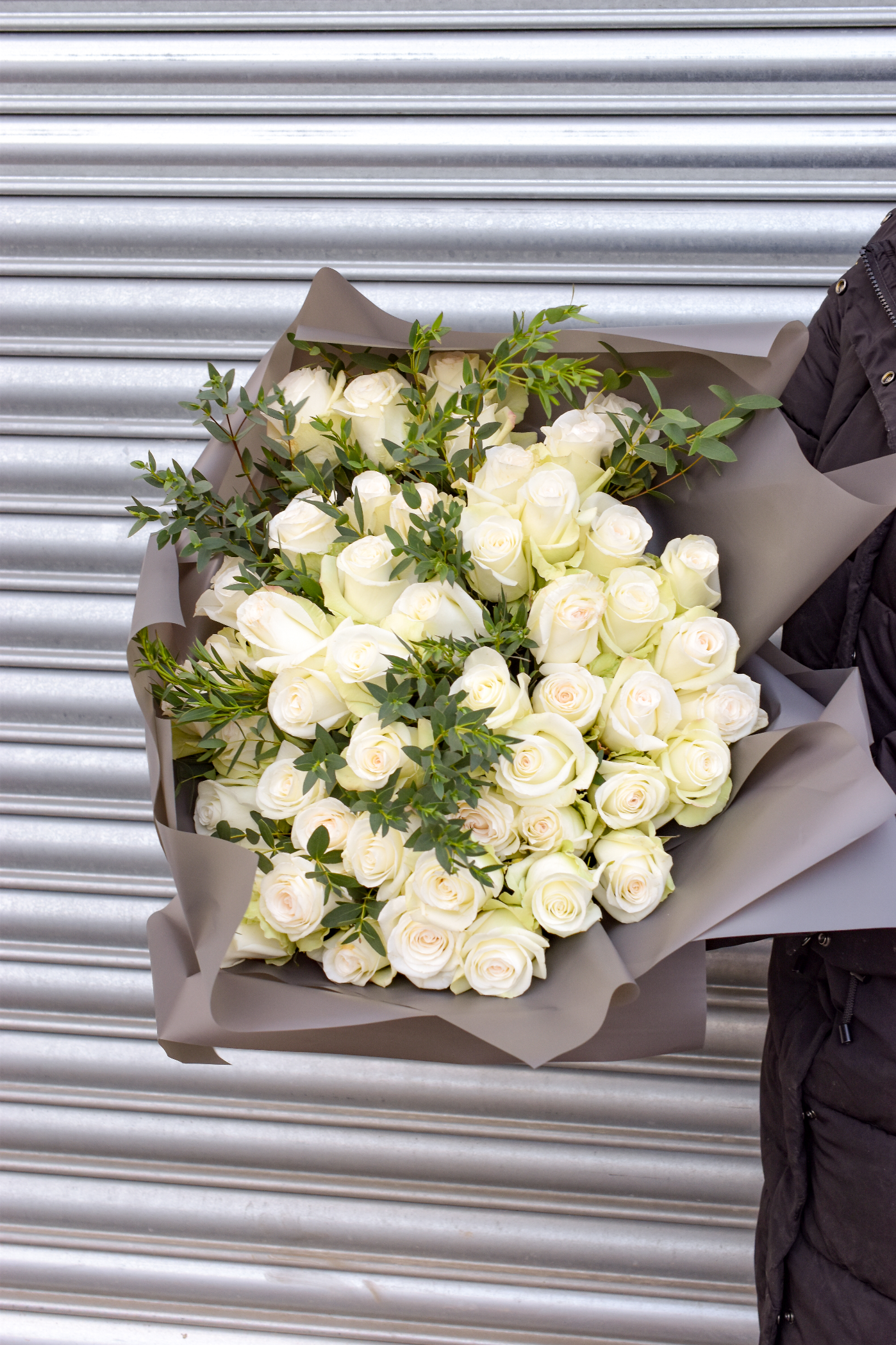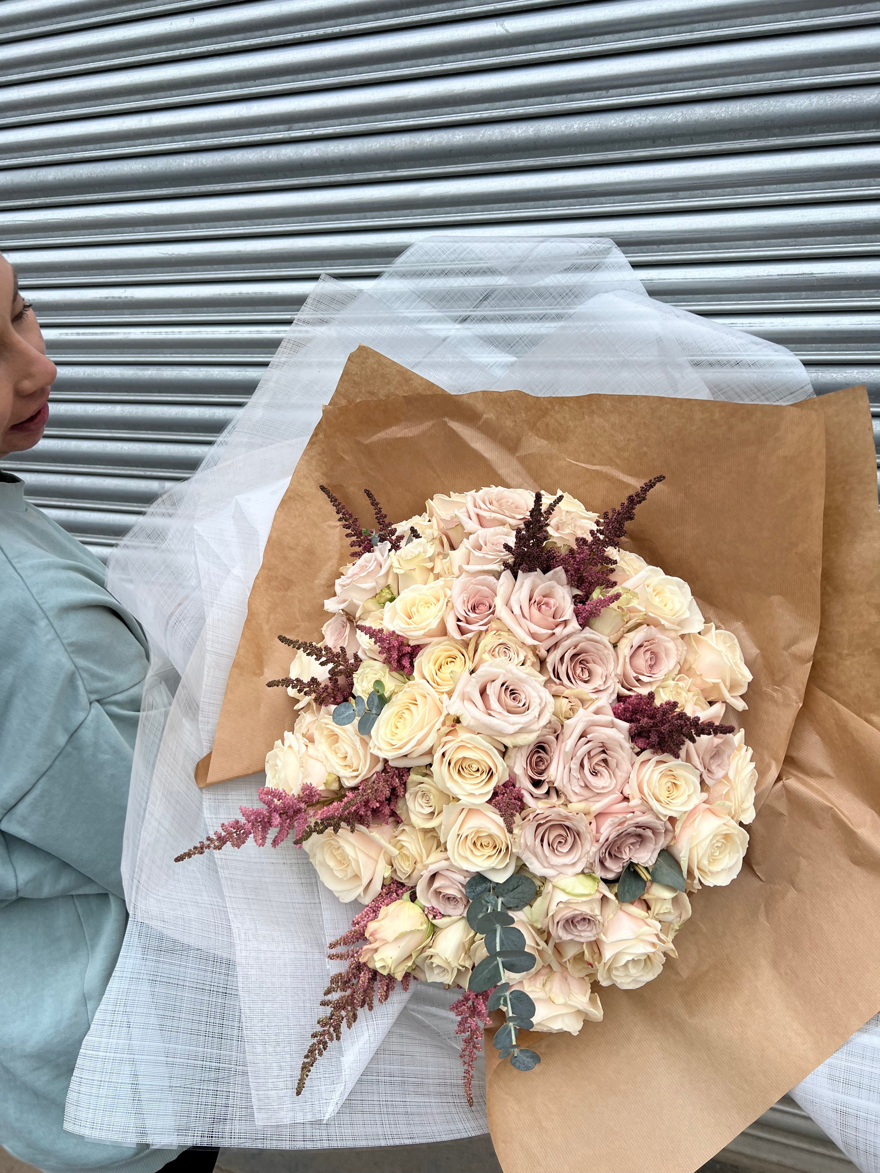 50 gorgeous roses accompanied by eucalyptus will definitely make a statement for your loved one! These will be Handtied,gift wrapped an presented beautiful in a gift box